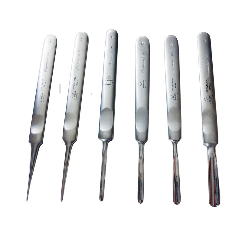 Strumenti affilatissimi in acciao inox sterilizzabile.