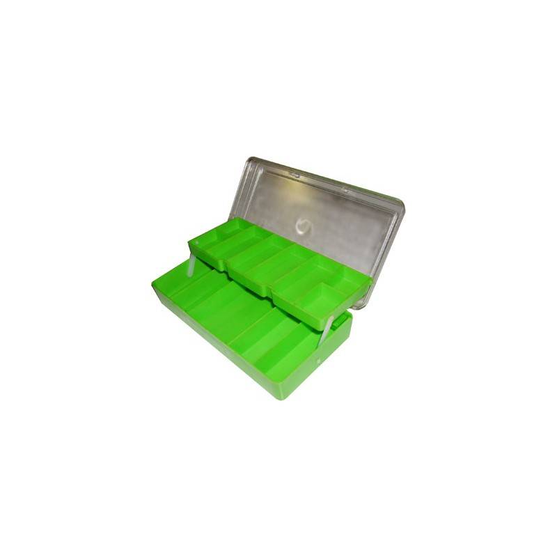 Scatola in plastica a due piani scorrevoli con scomparti e coperchio. Adatta per piccoli oggetti. Dimensioni totali: 21x11x5 cm