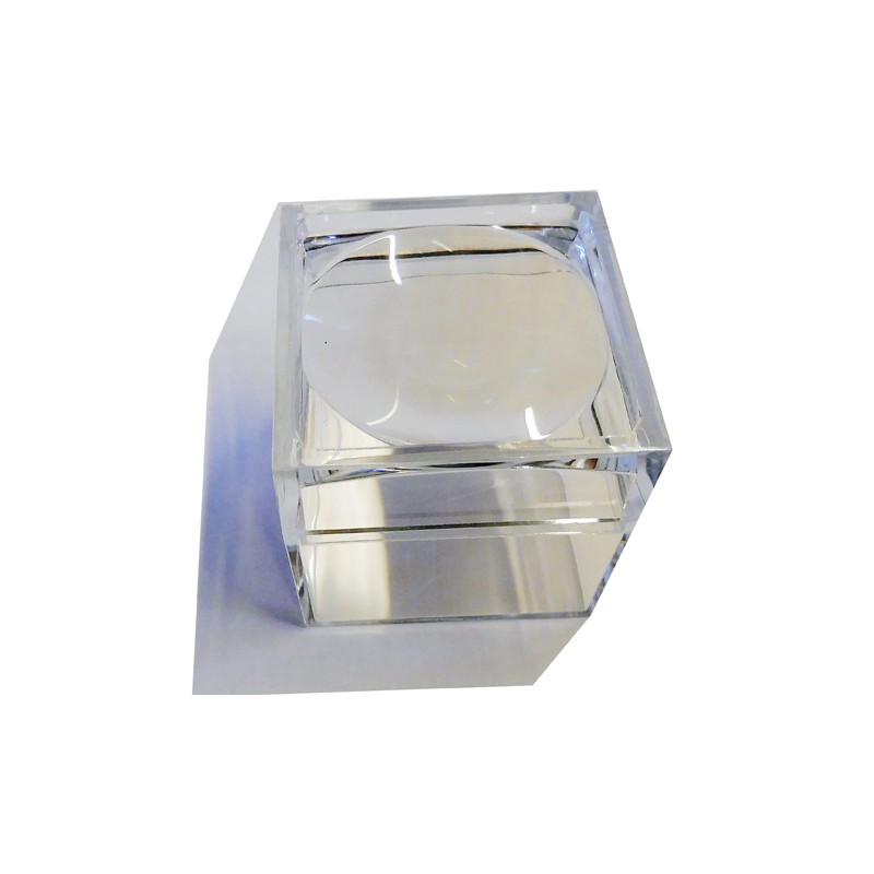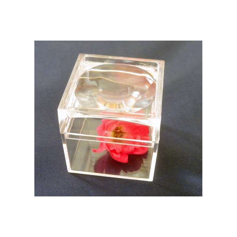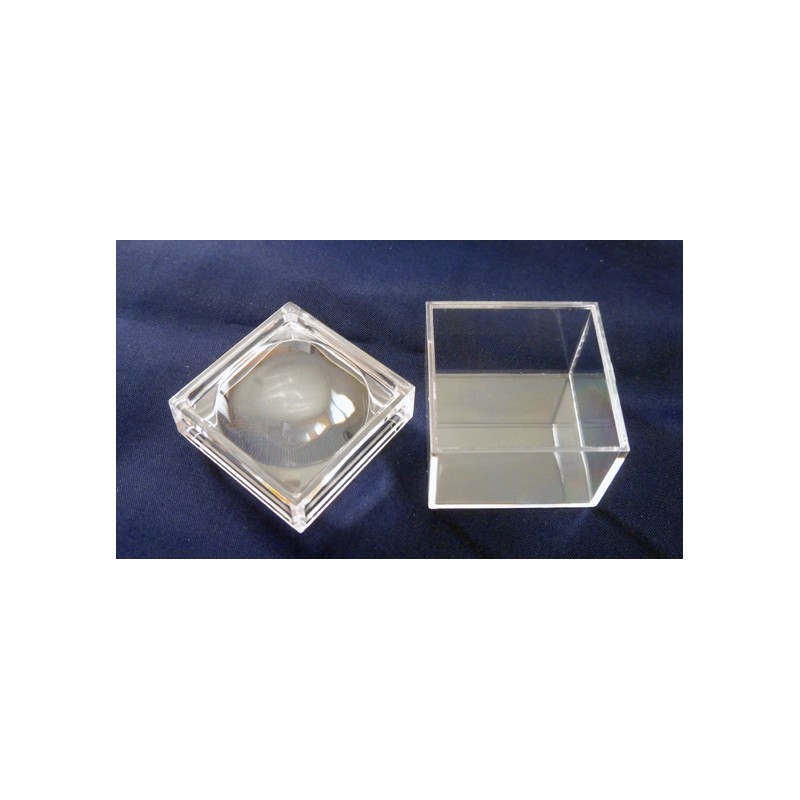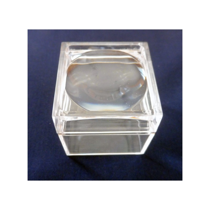 Scatoletta in plastica trasparente. Coperchio apribile con lente d'ingrandimento. Adatta per contenere e valorizzare piccoli oggetti da ingrandire come gioielli, ambra, minerali, conchiglie e fossili, insetti, oggetti da collezione, miniature.