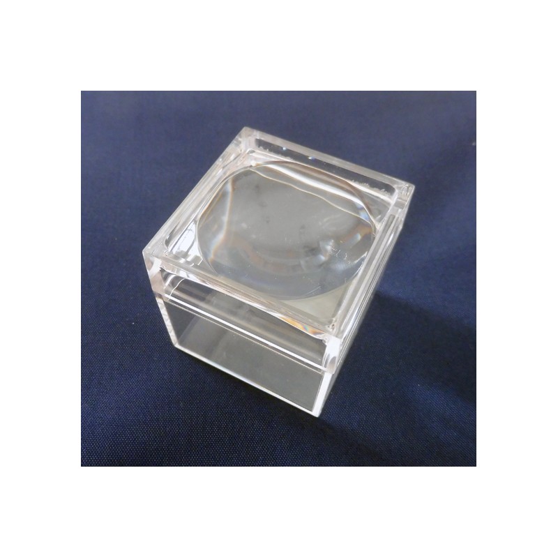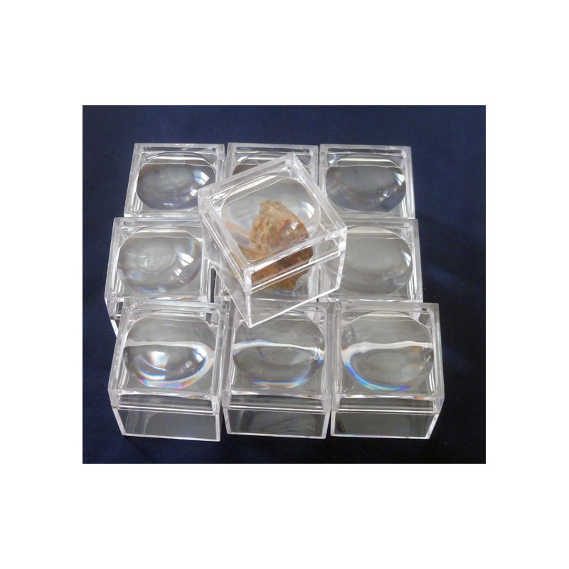 Scatola in plastica trasparente. Coperchio apribile con lente d'ingrandimento. Adatta per contenere e valorizzare piccoli oggetti da ingrandire come gioielli, ambra, minerali, conchiglie e fossili, insetti, oggetti da collezione, miniature.