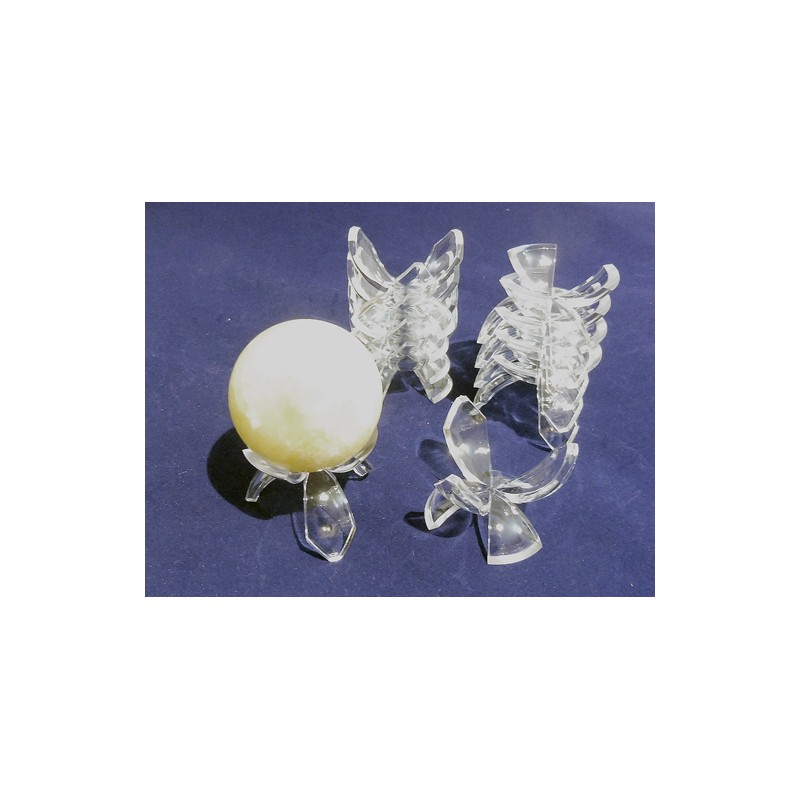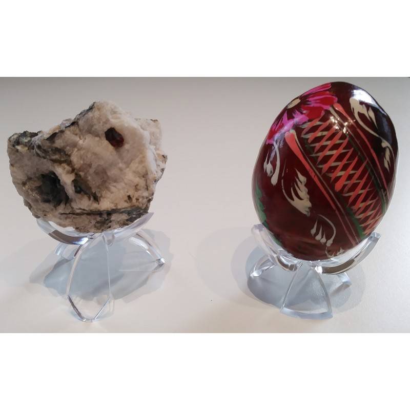 Supporto in plastica trasparente a forma di fiore. Adatto per minerali, fossili e conchiglie e oggetti a forma sferica: uova di legno, di cioccolato, sode e decorate.