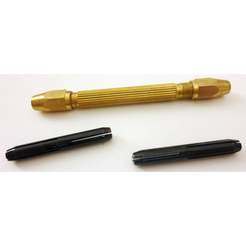 Trapanino manuale in ottone. Fornito con 2 mandrini con 2 pinze. Diametro utilizzabile: 0 - 3,2 mm. Lunghezza 100 mm